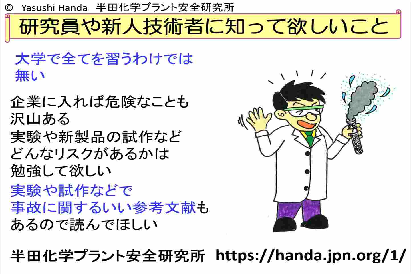 新人研究者技術者のためにこんないい本もある。「現場で求められる知識と行動指針」安全の手引き書だ
